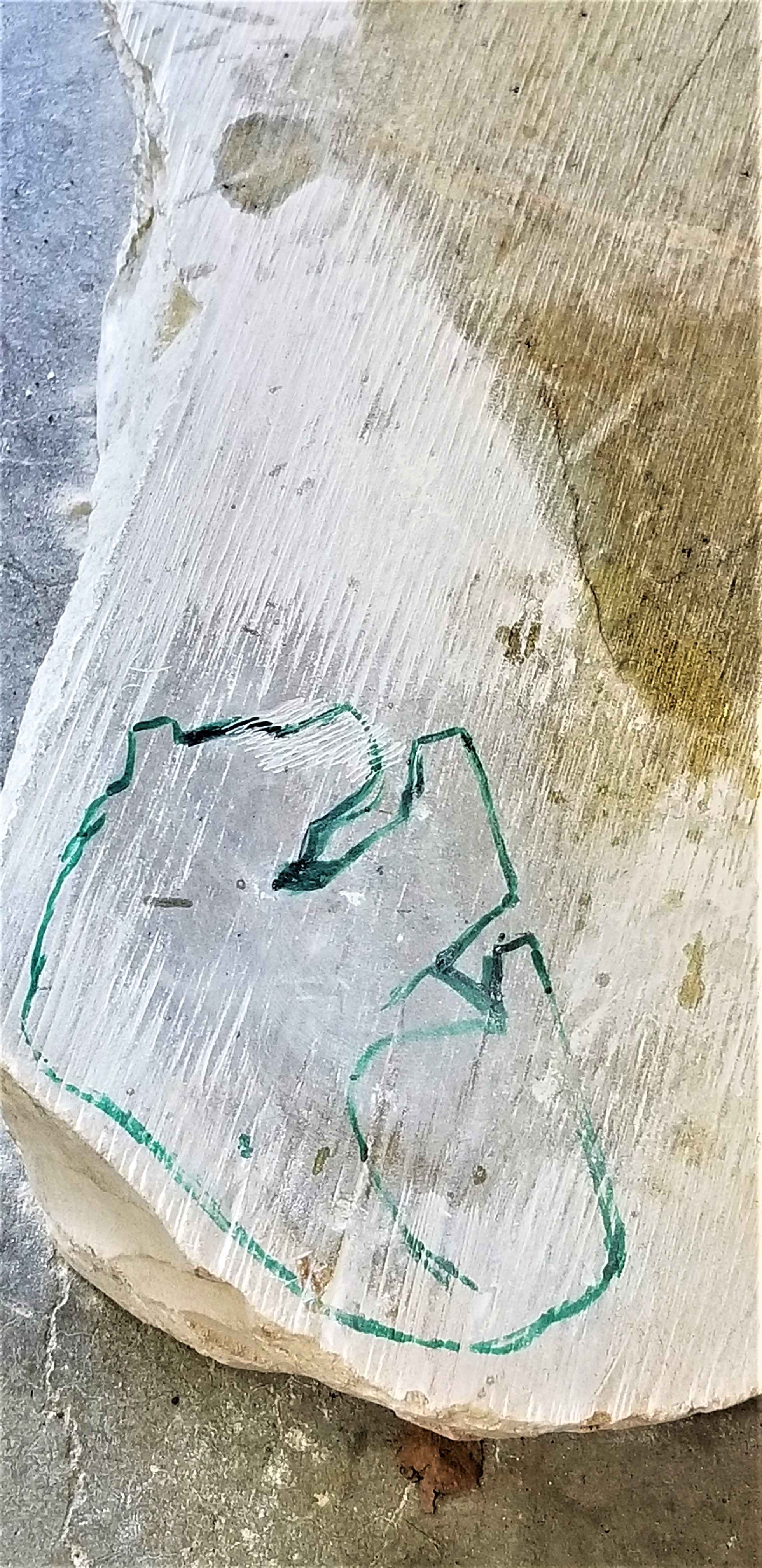 To break up large stones he uses a bandsaw to create smaller stones that are easier to work with. Once he selects a stone of the right size and color for his intended design, he sketches a rough outline in Sharpie directly onto the stone.